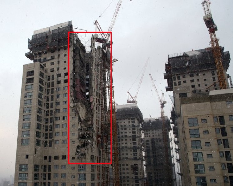 제일 처음 붕괴가 발생한 층은 39층입니다. 이 39층의 바닥 시공 방법과 지지 방식은 애초의 설계와 다르게 진행되었습니다. 옥상층인 39층과 38층 사이에는 배관등을 설치하는 별도의 PIT 층을 두는 설계였는데 이 PIT 바닥 시공 방식을 작업의 용이함을 살 리가 위해 임의로 설계 변경을 하면서 하중이 중앙으로 집중된 것으로 밝혀졌습니다.